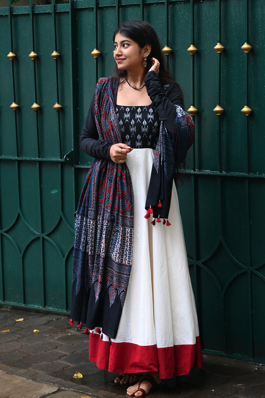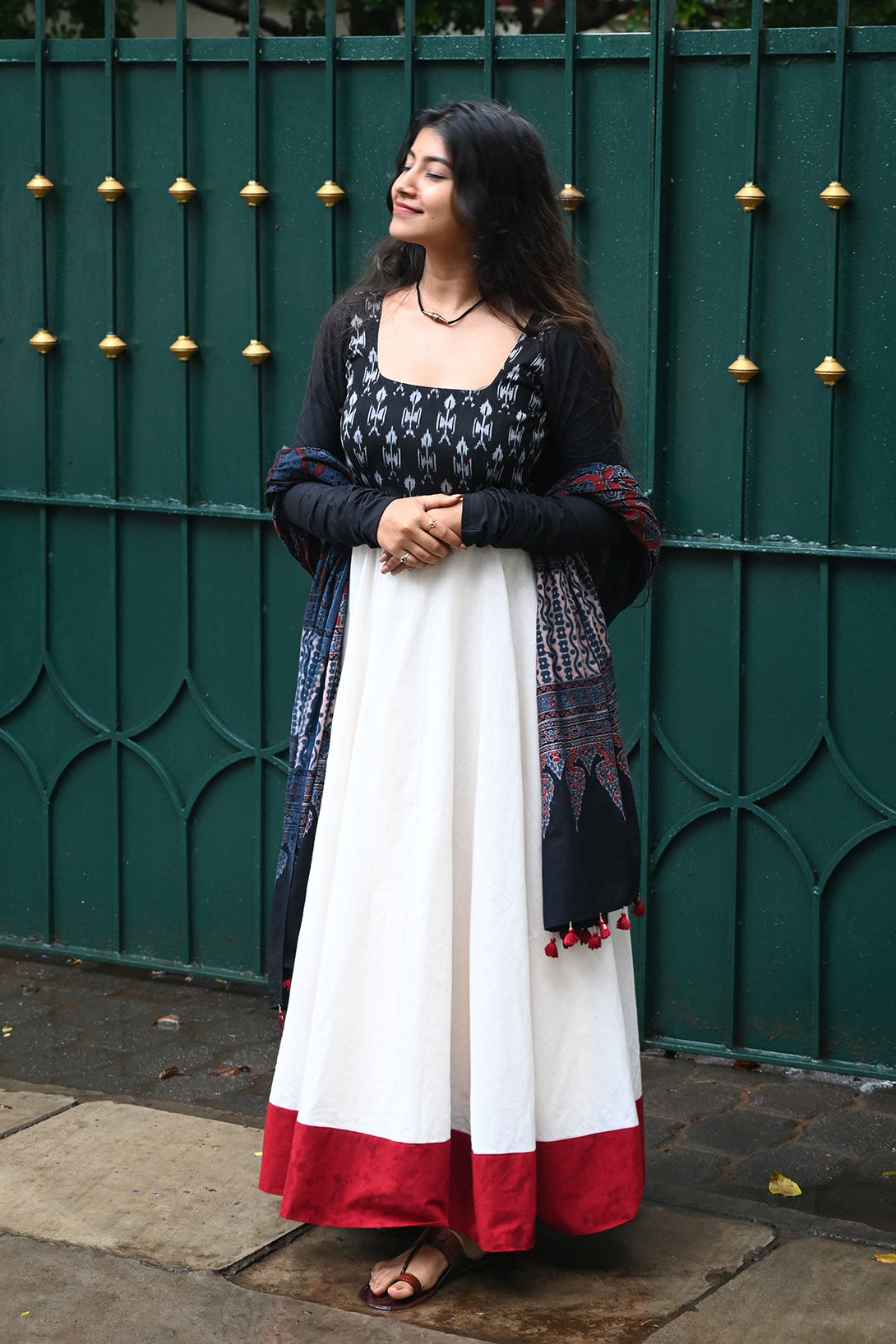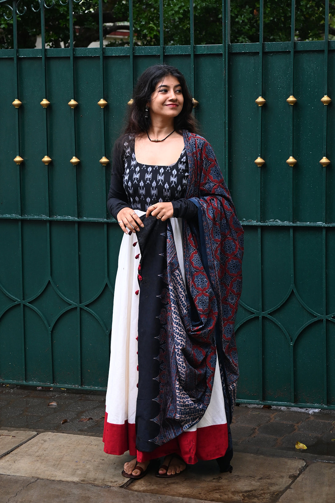 Black and White Anarkali with Kalamkari Dupatta