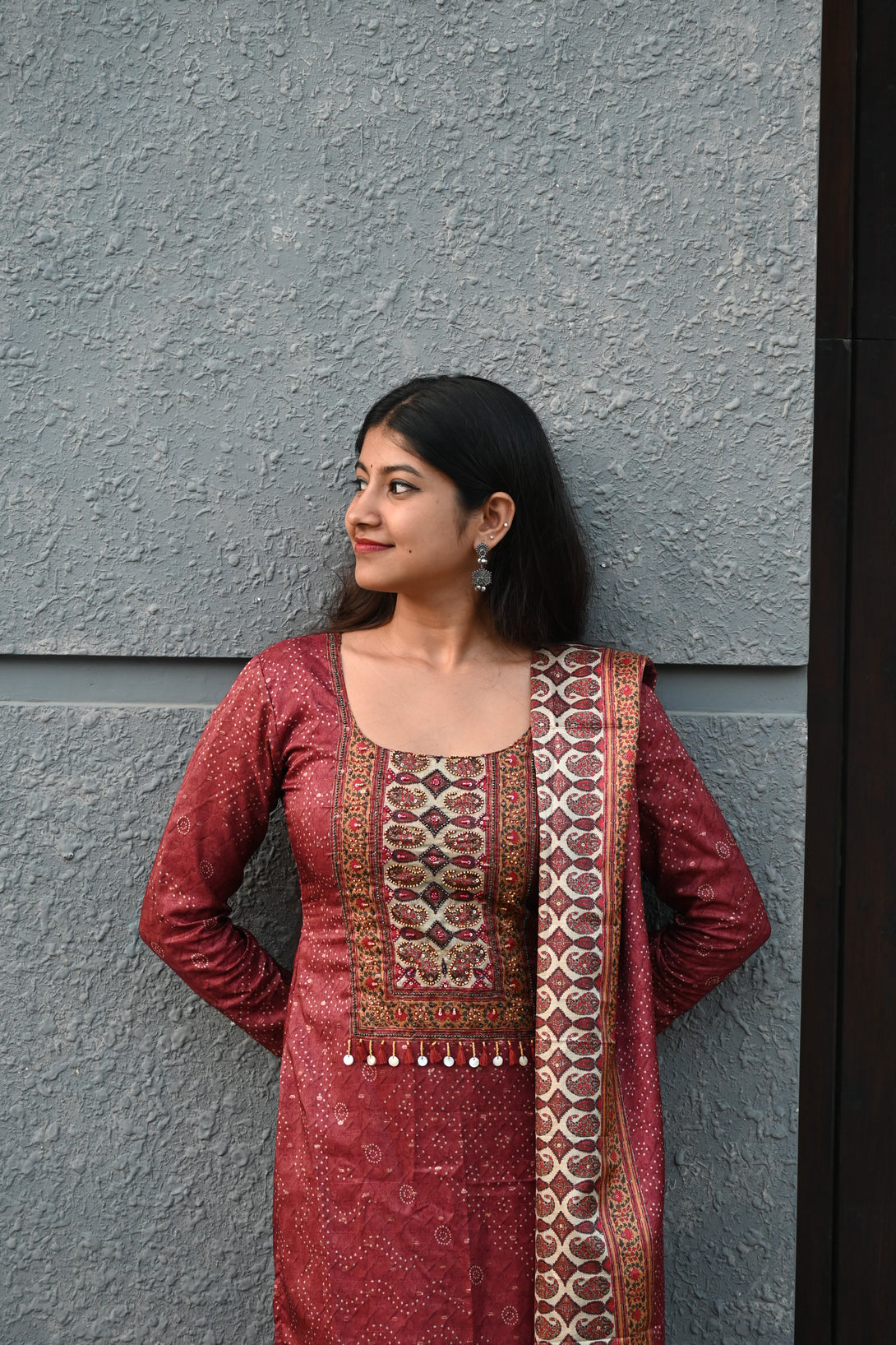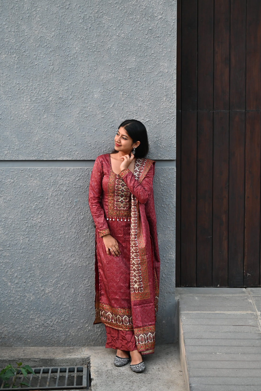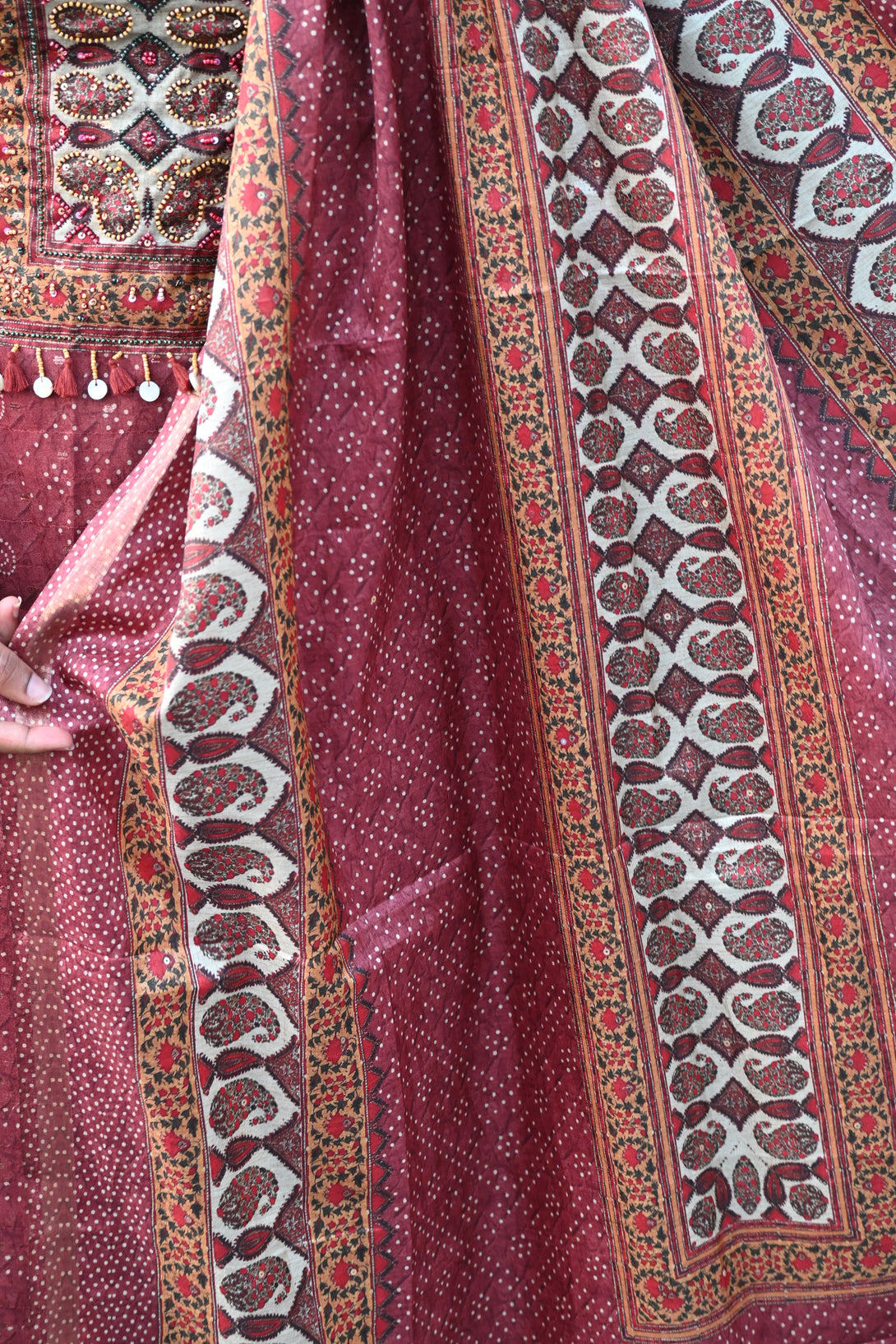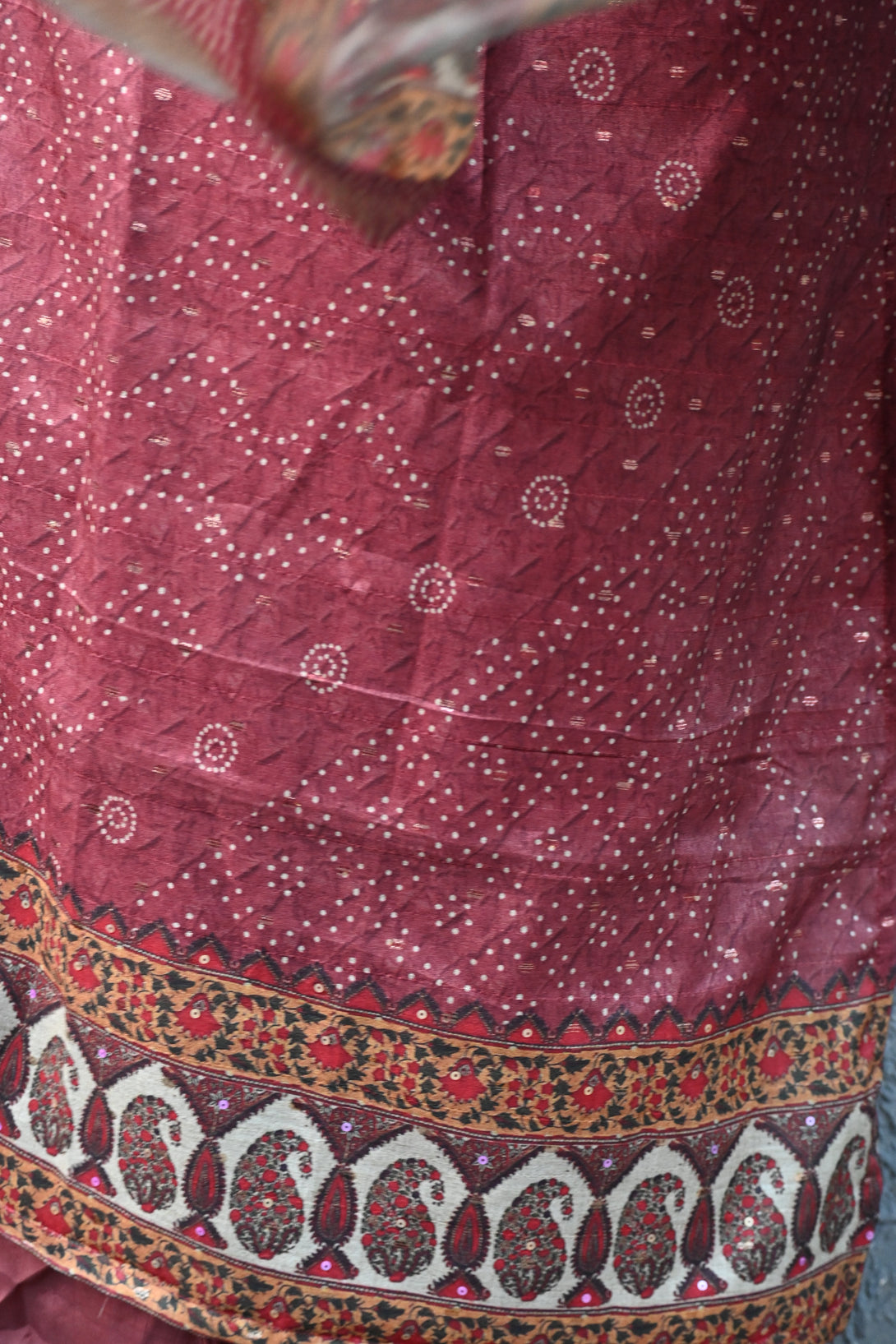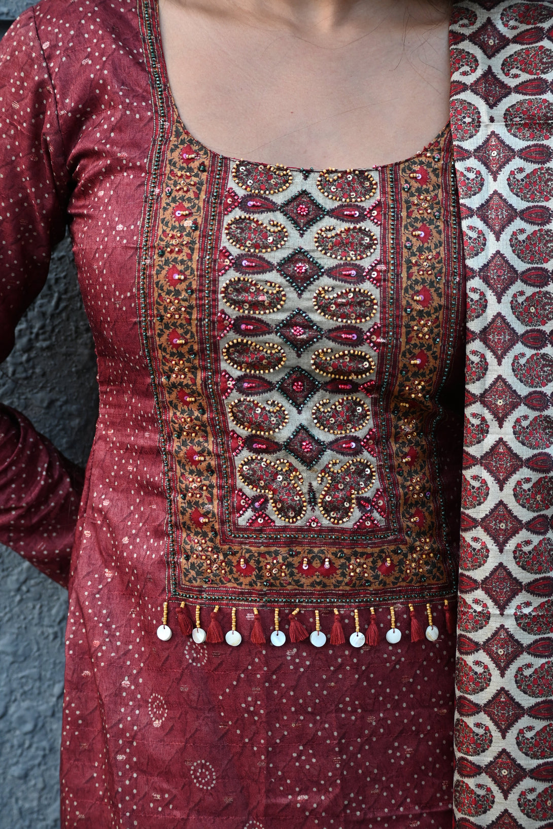 Brown Soft Tussar silk top with handwork on yoke( Full set)