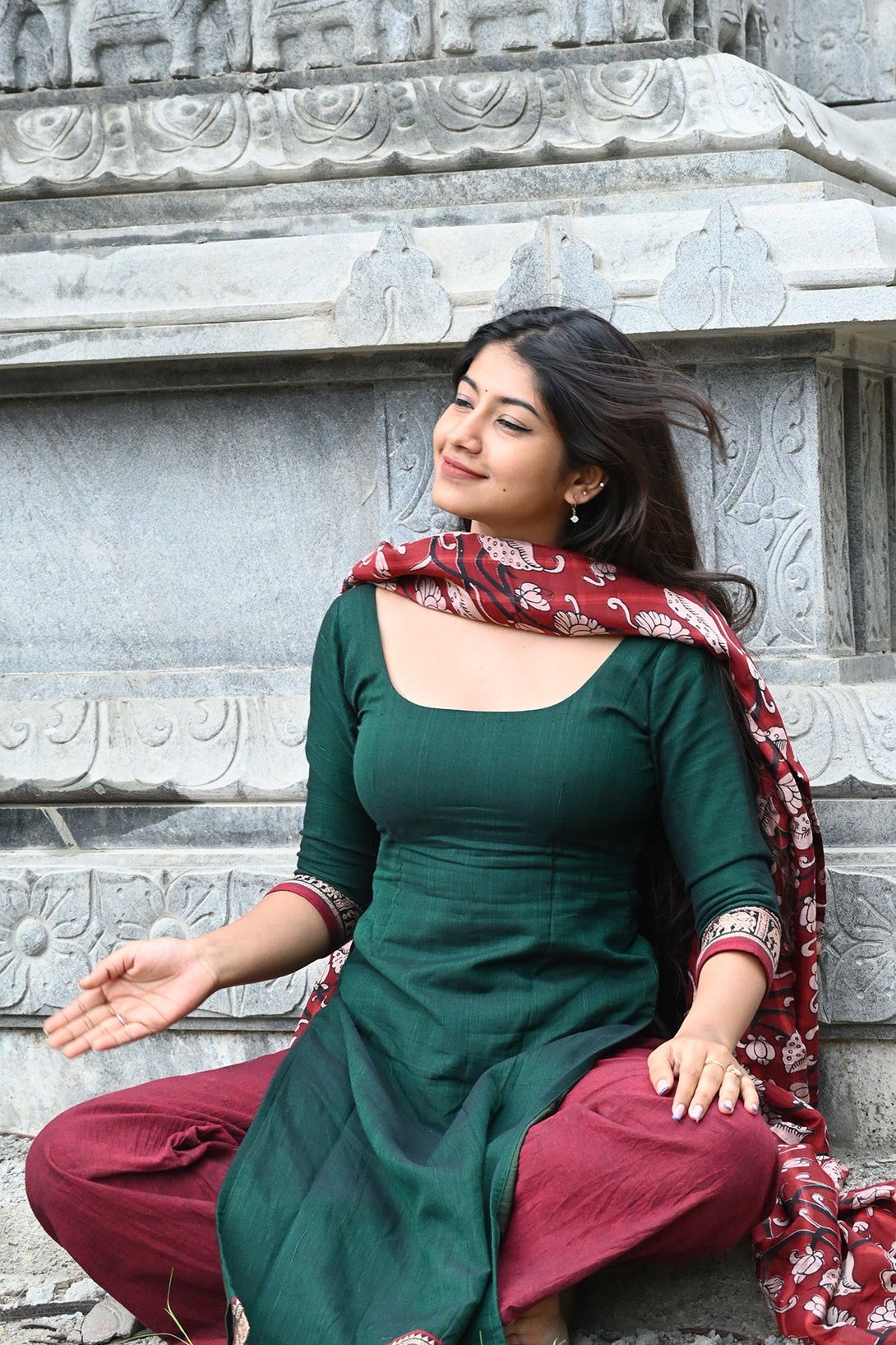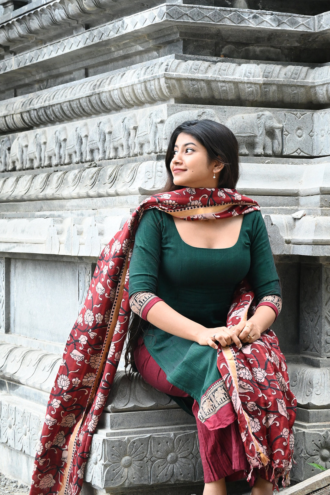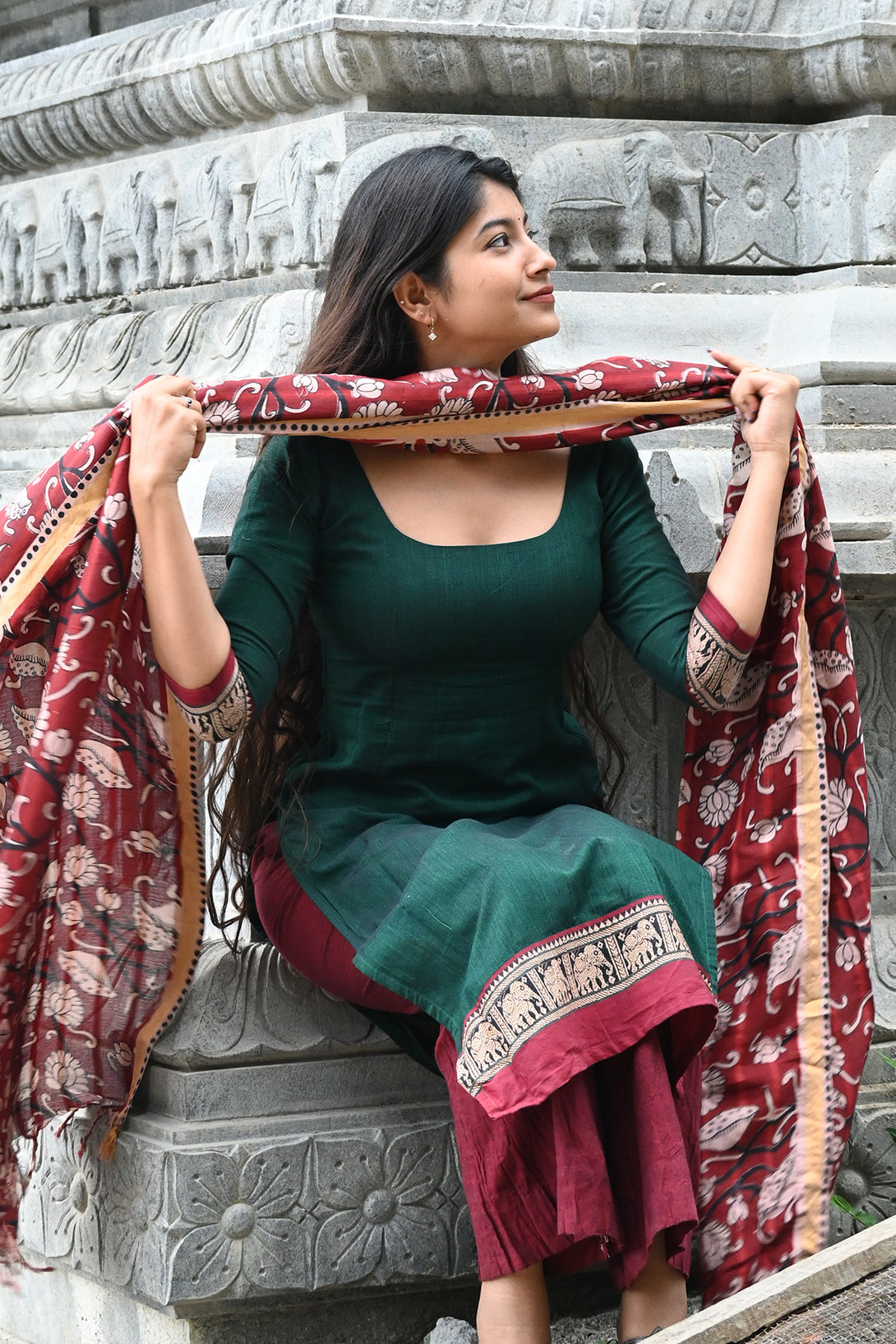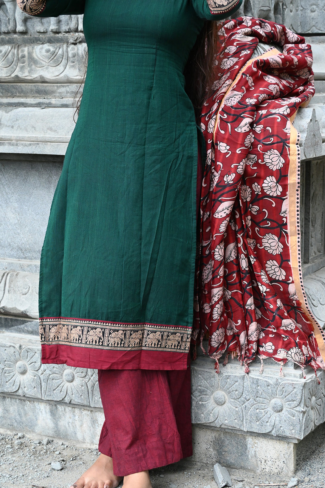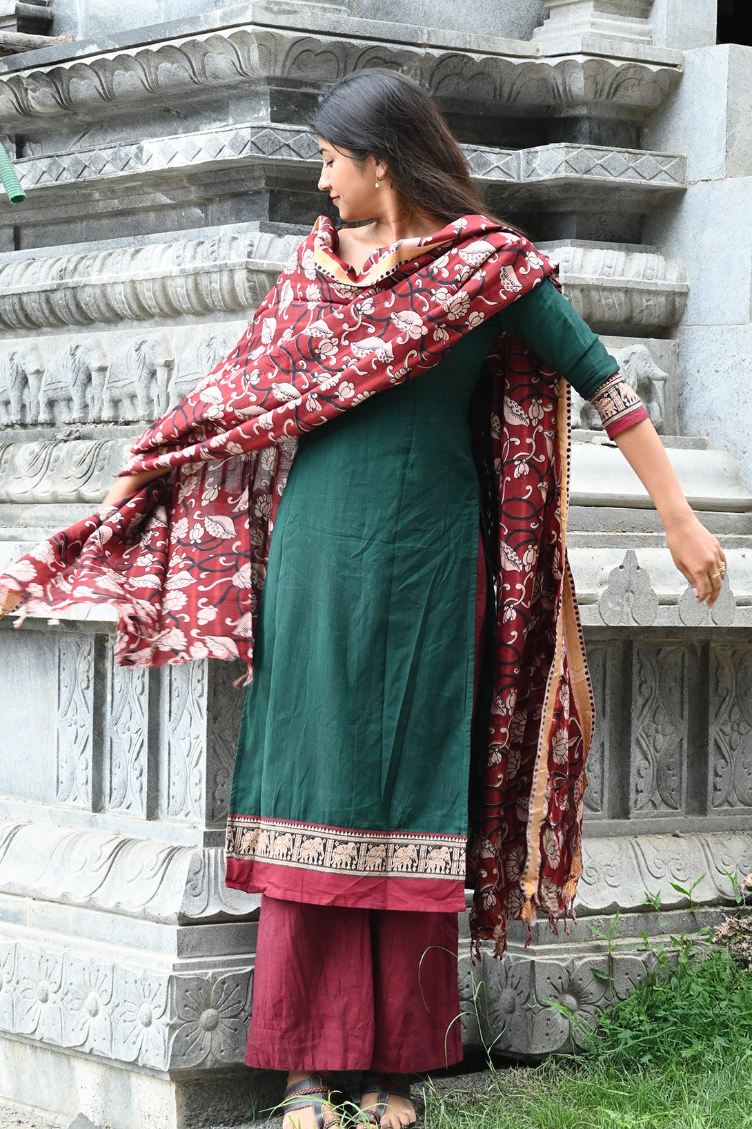 Green Pure Handloom Top and Kalamkari Dupatta with Bottom