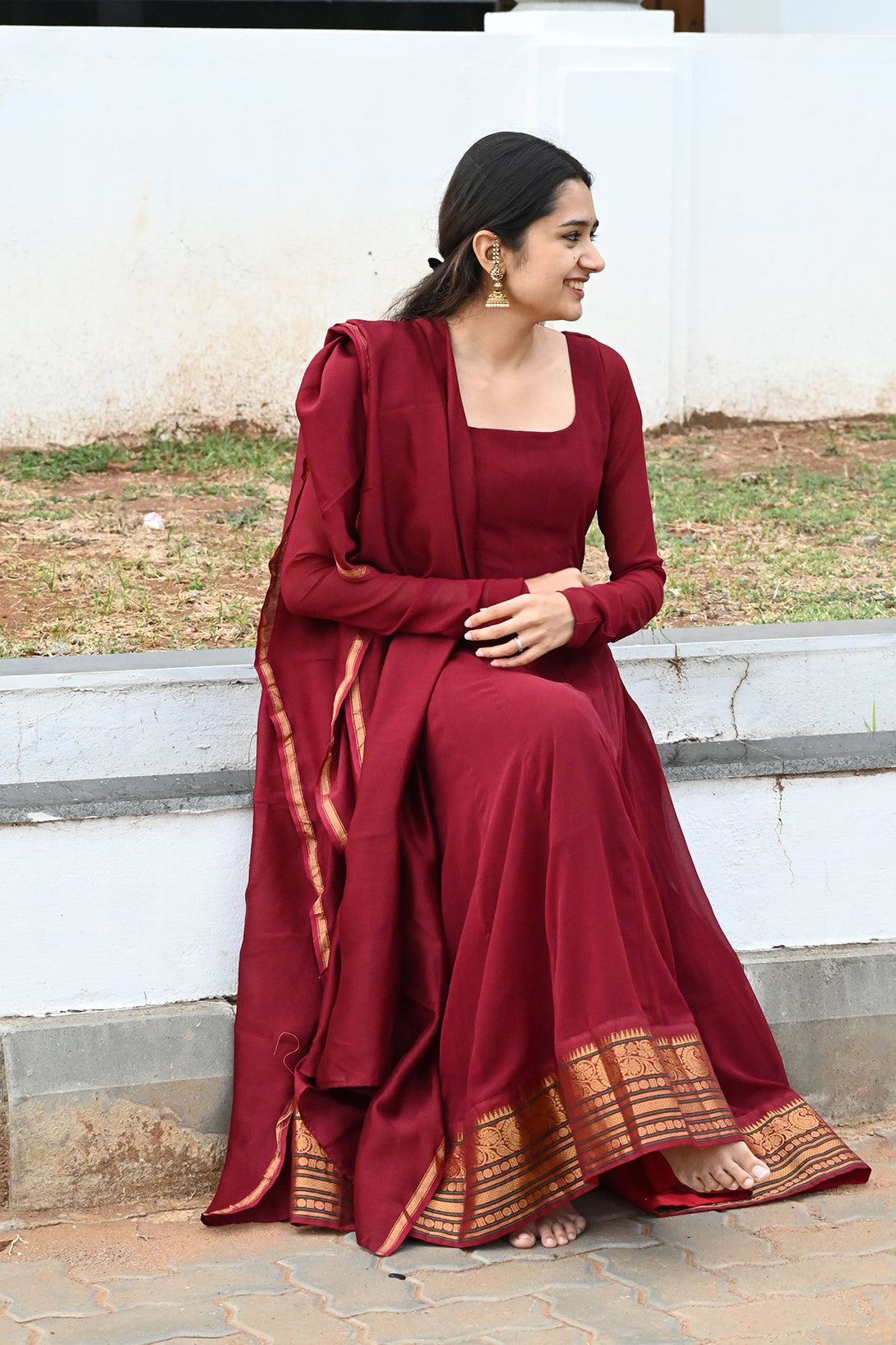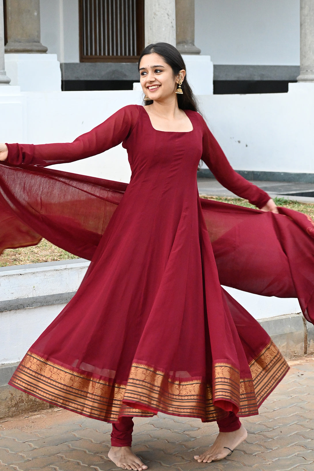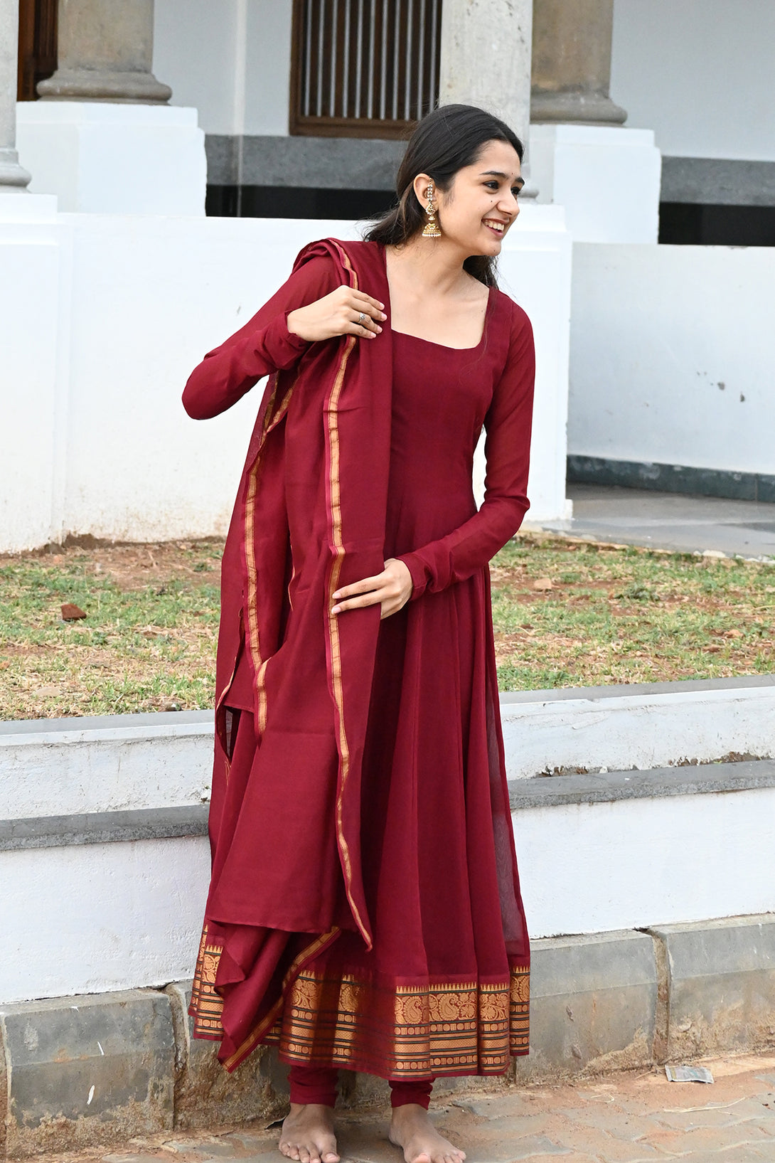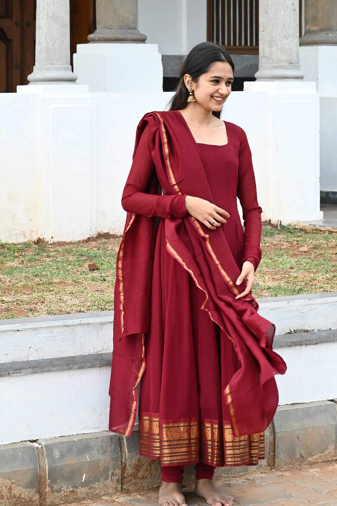 Maroon Anarkali with Chettinadu Border and Pure Chanderi Hand Dyed Dupatta