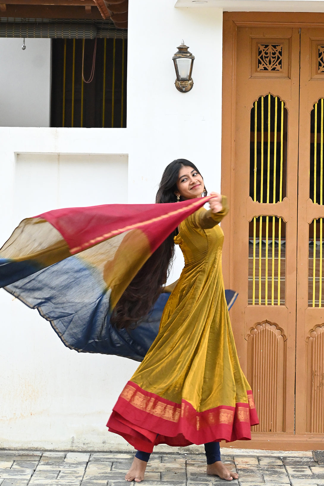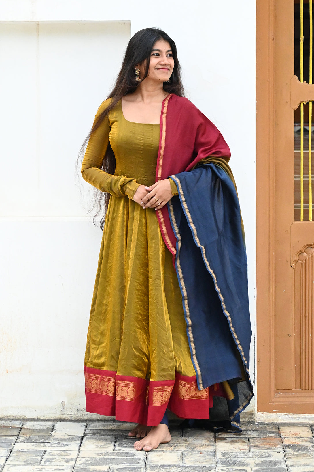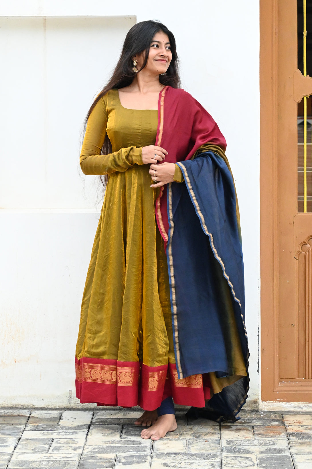 Mehendi Gold Anarkali with Chettinadu Border and Pure Chanderi Hand Dyed Dupatta
