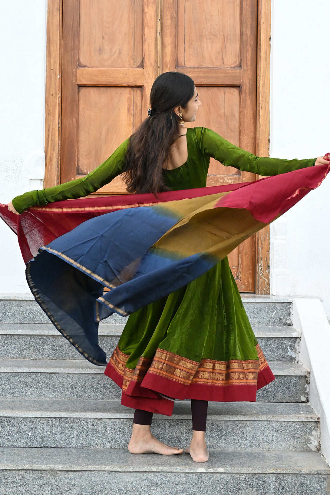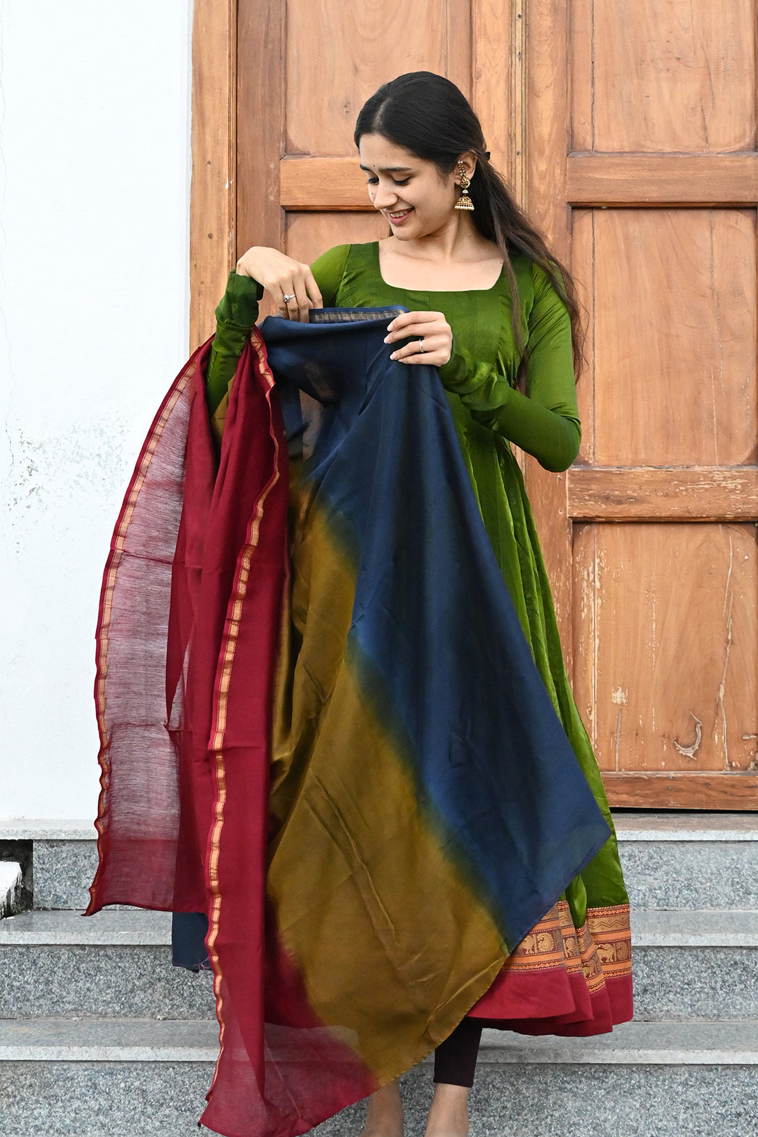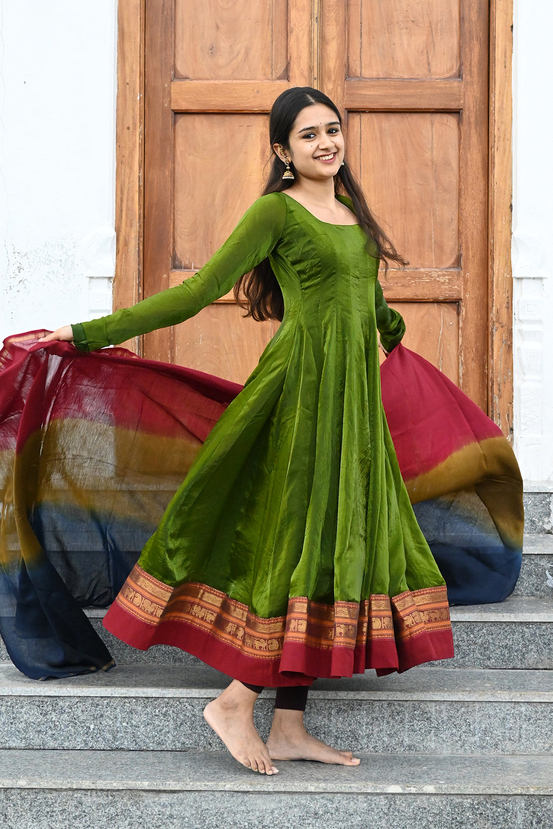 Olive Green Anarkali with Chettinadu Border and Pure Chanderi Dupatta