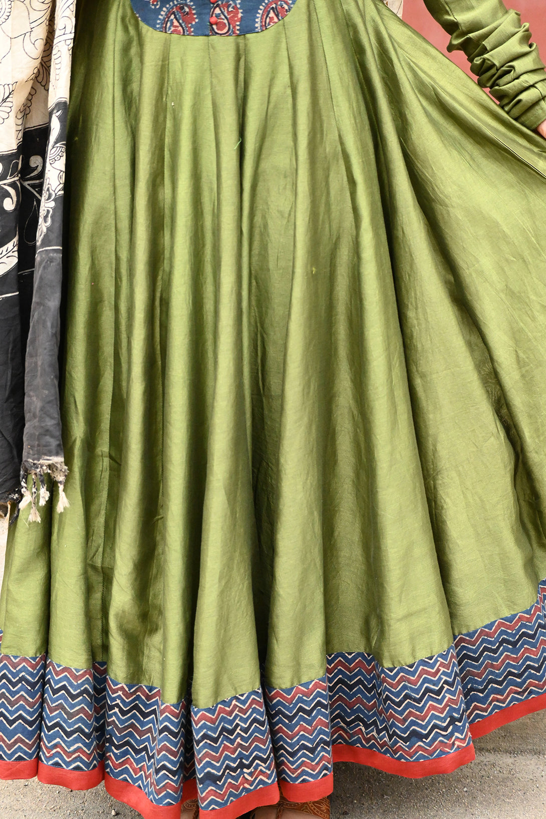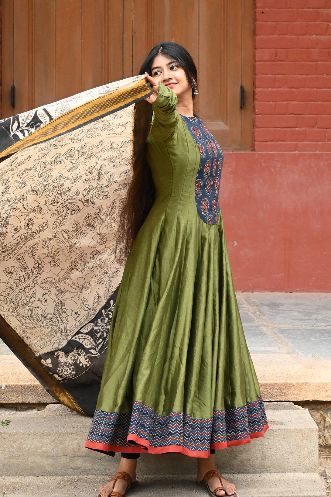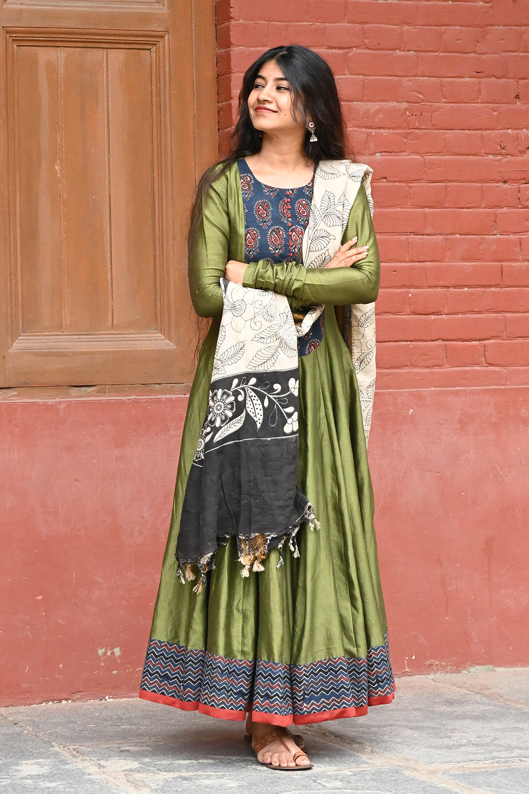Olive Green and Indigo Anarkali with Kalamkari Dupatta