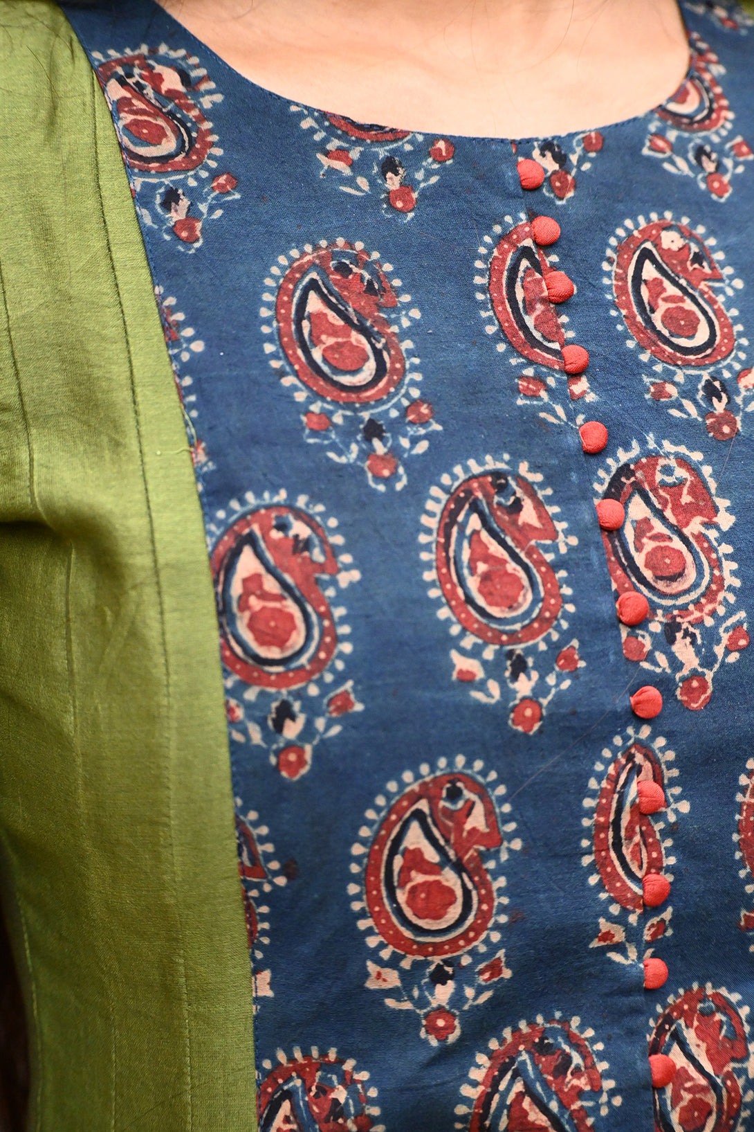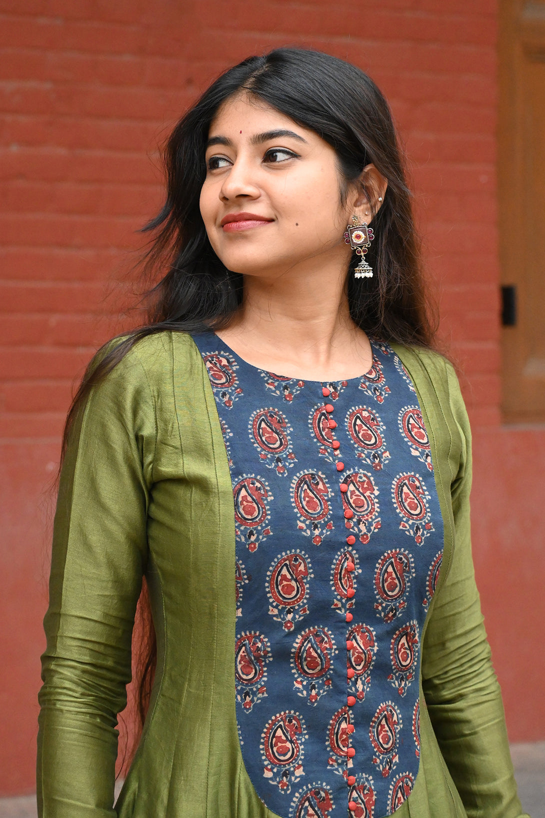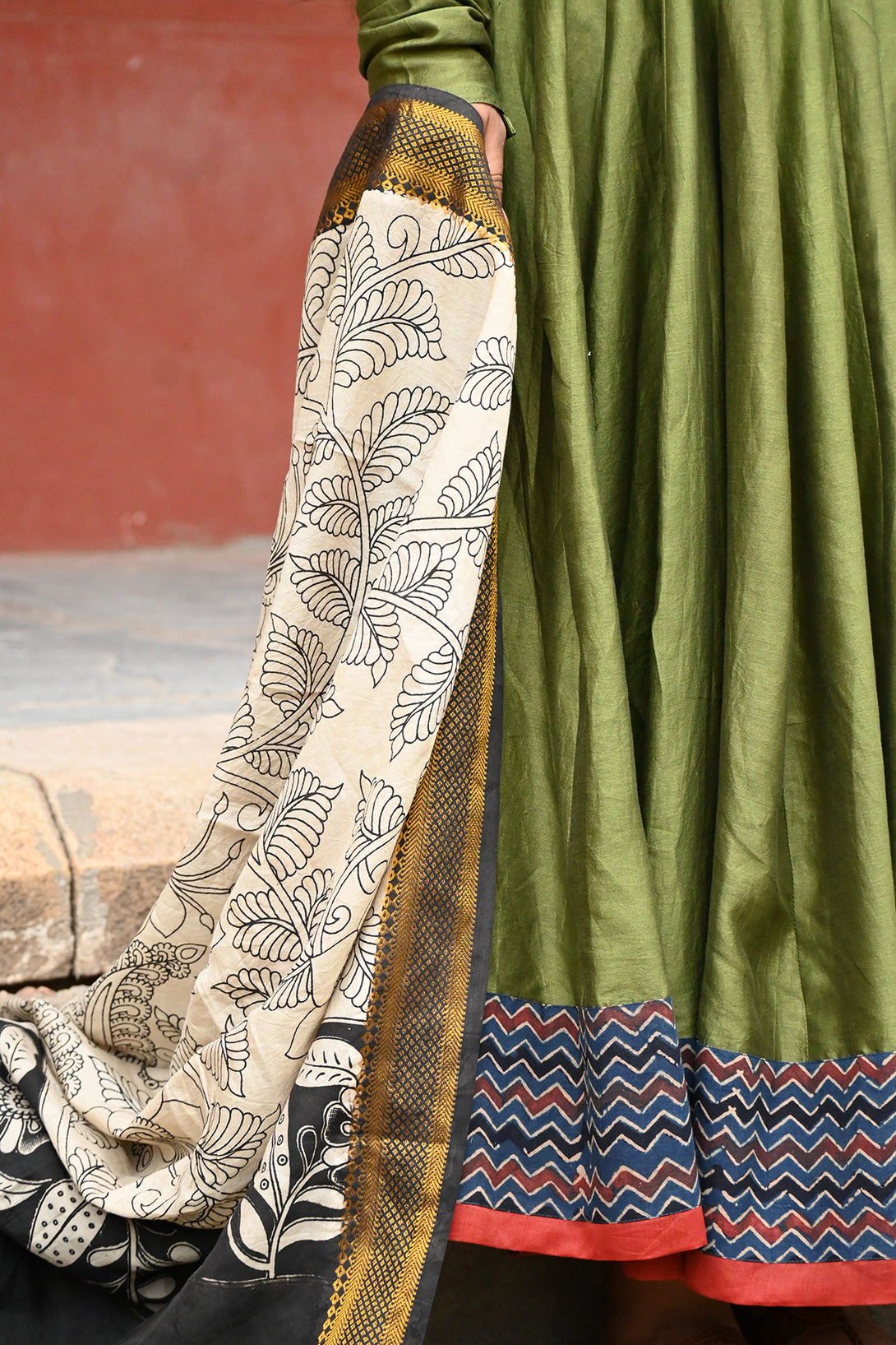 Olive Green and Indigo Anarkali with Kalamkari Dupatta